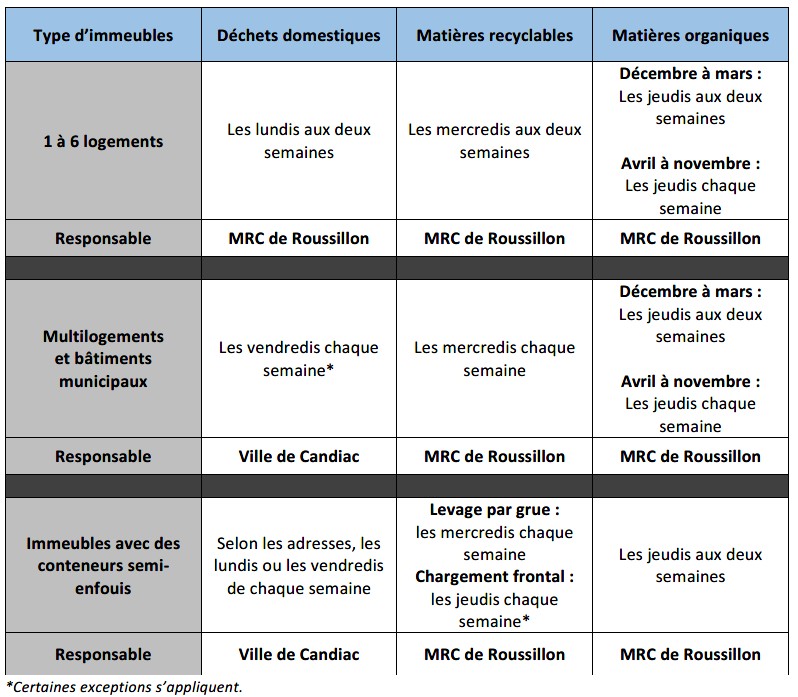 Qu’il s’agisse de feuilles, de branches, de résidus domestiques dangereux, de gros rebuts, de surplus de carton, de piles usagées ou de matériel électronique, Candiac offre une variété de services aux citoyens en matière de collectes et récupération. Elle peut d’ailleurs compter sur la collaboration de la MRC de Roussillon pour mener à bien de nombreux projets. Visitez le site web de la MRC de Roussillon pour connaître toute l'information pratique reliée aux diverses collectes.